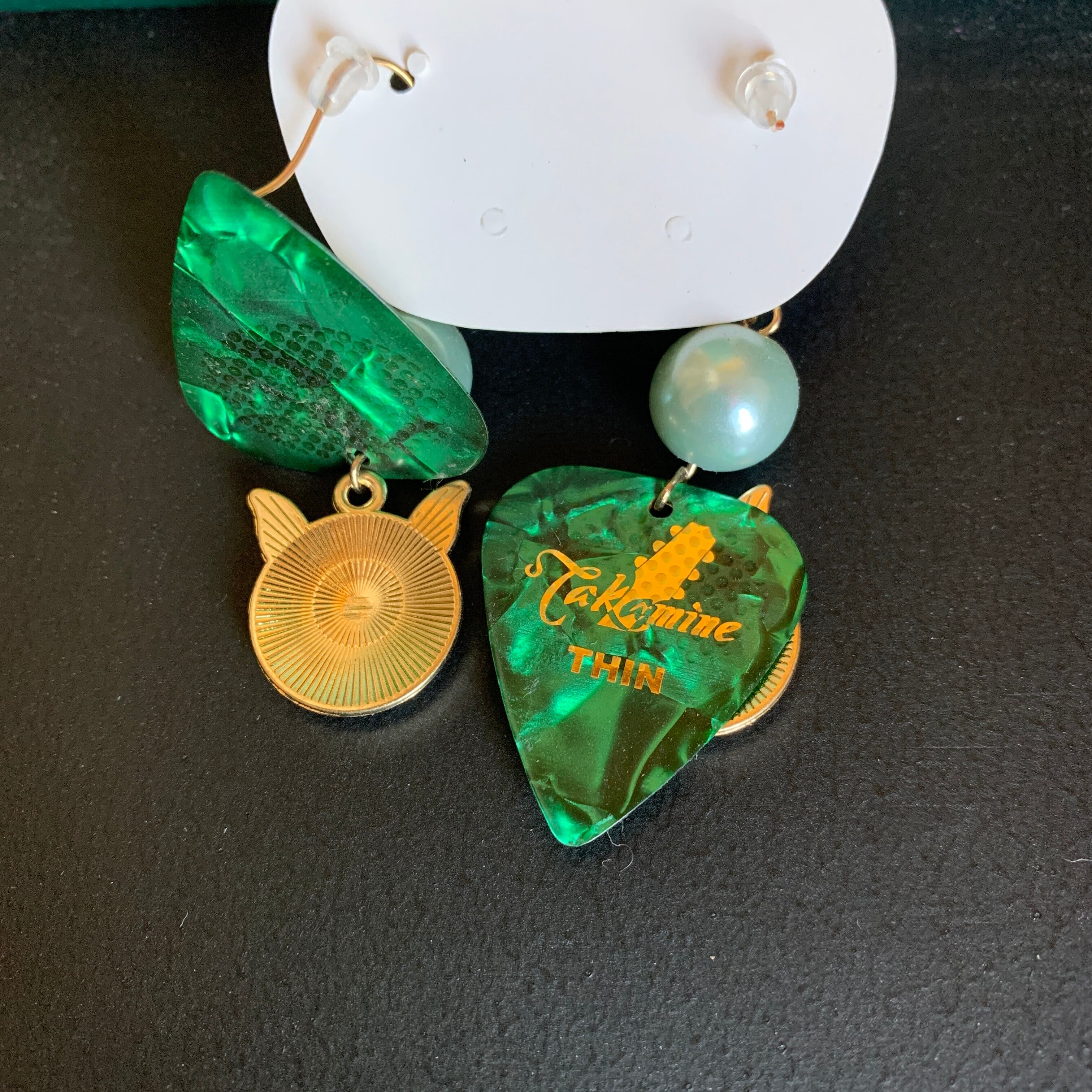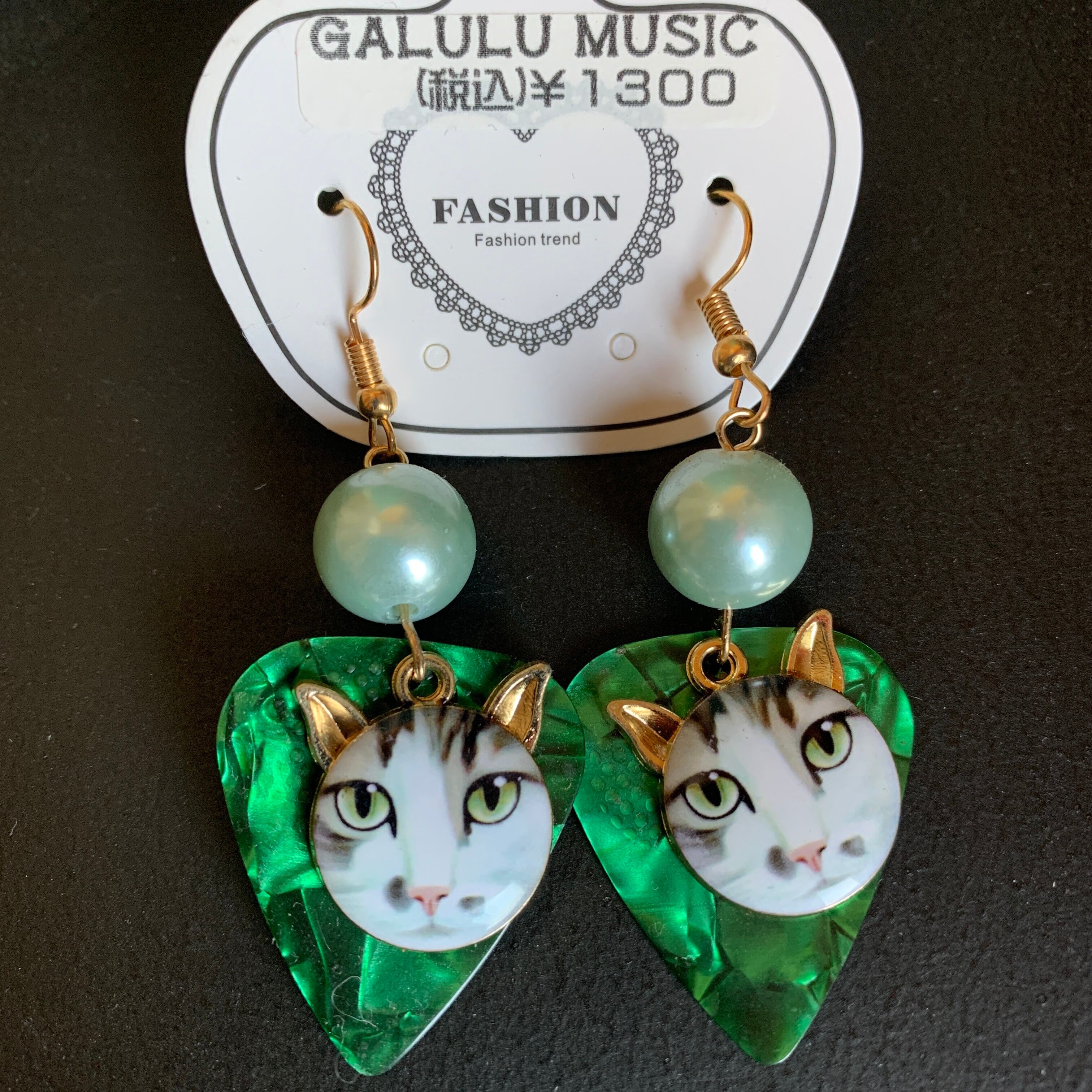 【ギターピックピアス30 猫のサバトラちゃんグリーン】